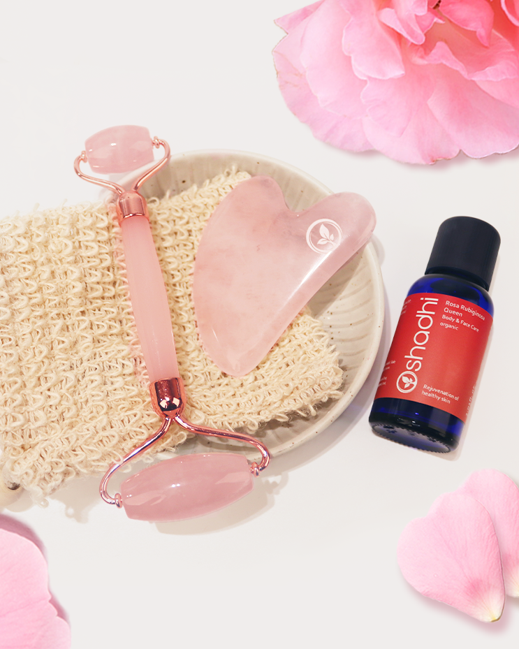 The beauty set contains a rose quartz roller, a Gua Sha stone and Rosa Rubignosa Queen facial oils that are perfect for this occasion. With the three tools, you can easily treat yourself to a daily facial massage - the Gua Sha massage.